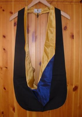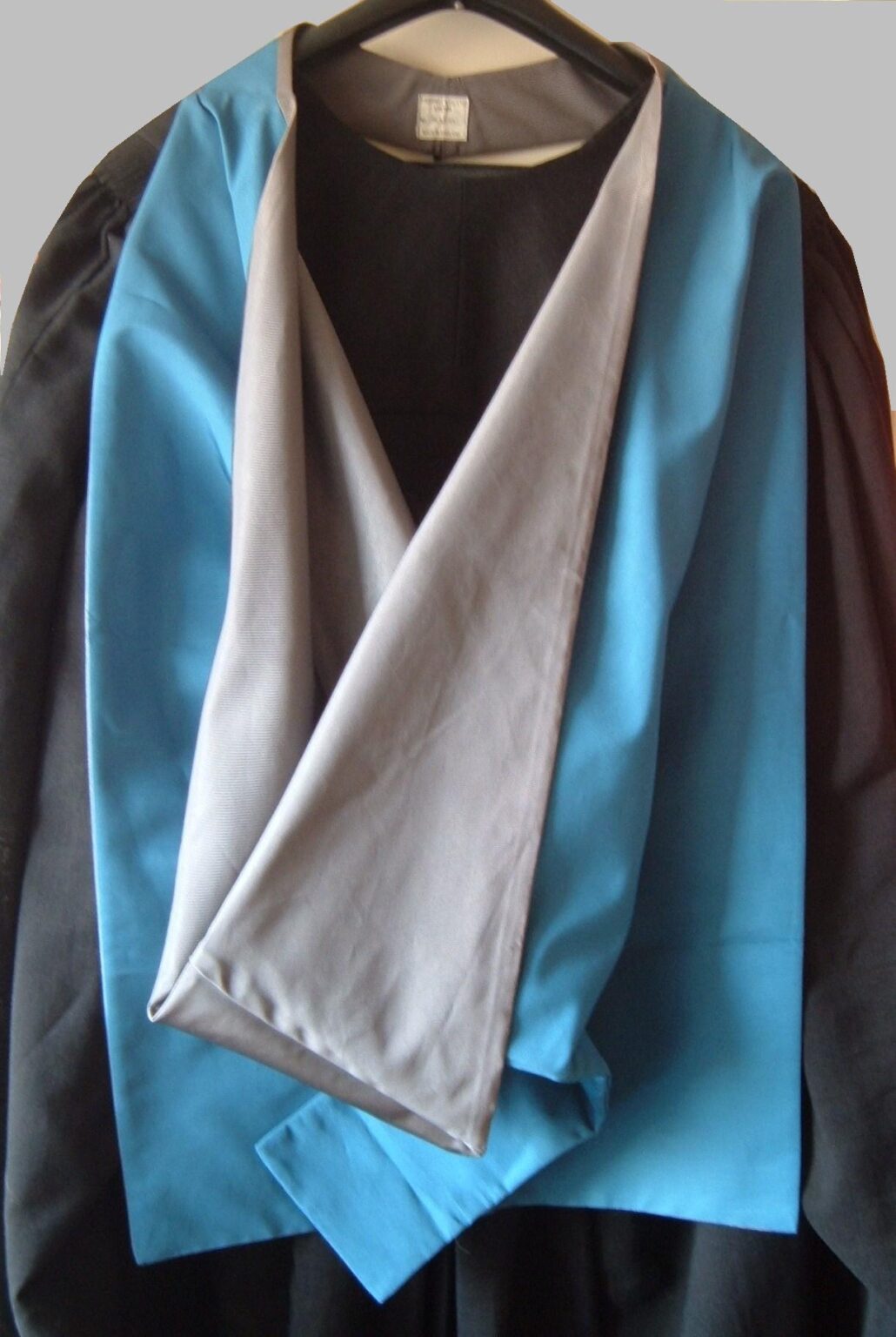 All Strathclyde hoods are made in ‘saltire blue’, and lined with white (Arts) or gold (Sciences), and further bound with various colours to denote other degrees: the lining depends on which of the two better suits, so a red binding on the Arts hood is Laws, but in the Science hood is Architecture. One peculiarity is that the doctors (both PhD and higher) revert to the relevant bachelor’s hood. However, the system is starting to break down, with a number of exceptions now being included.