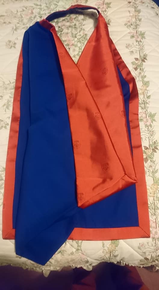 This hood is basically a bachelor’s hood but without the faculty lining. Leicester had used its hoods for degrees validated at other institutions but differenced with a cord binding: the green, blue, and gold one was used at Bishop Grosseteste College in Lincoln; it is not clear why it was chosen for the PGDip hood. Undergraduate certificates and diplomas have this hood without the cord.