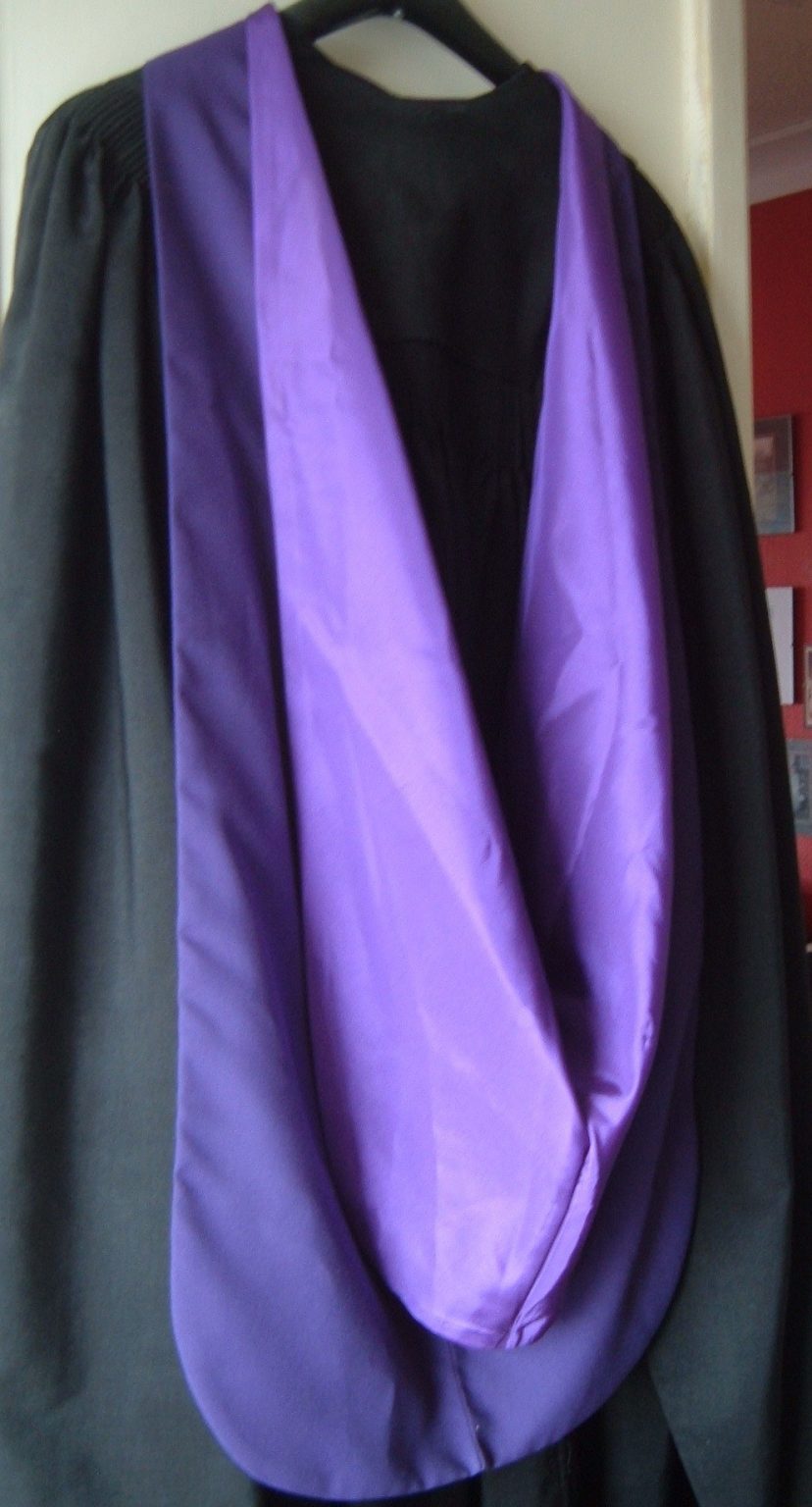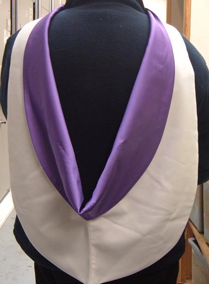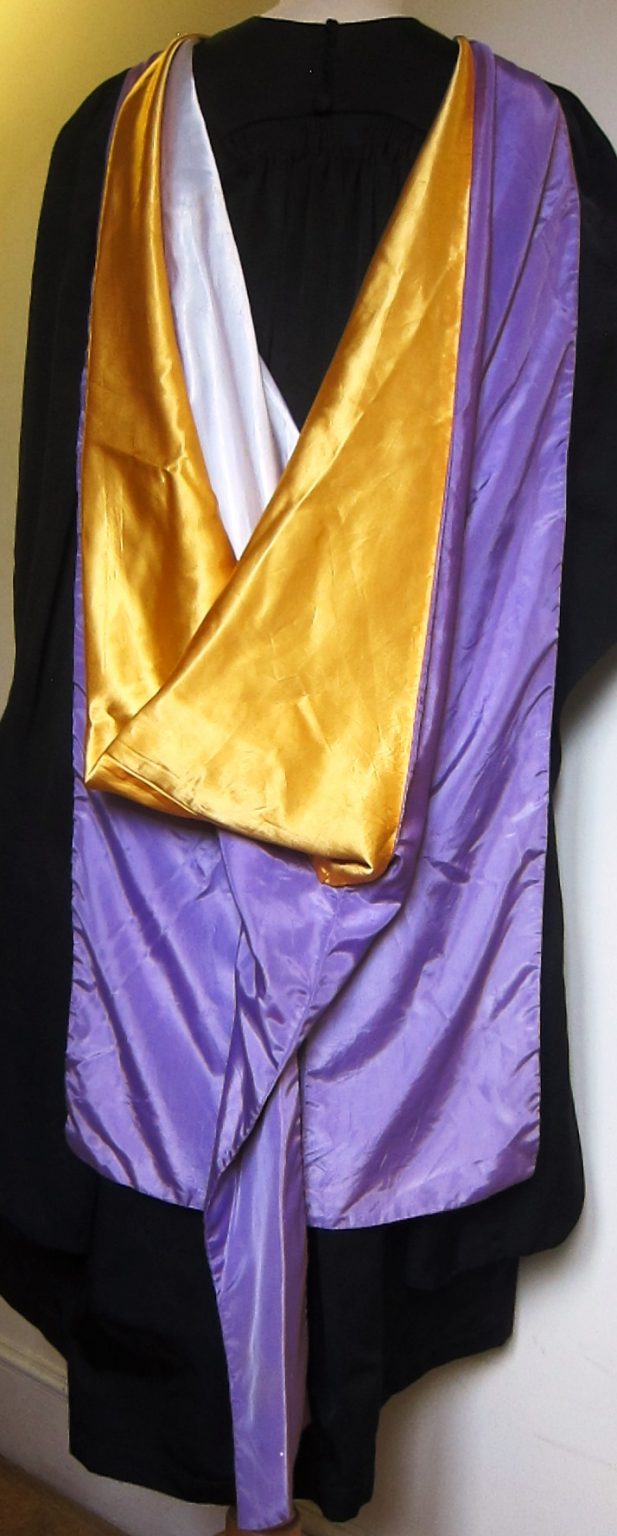 This hood came into being in 1852, when St David’s College was granted the right to award the BD. It has not been possible to find out why a violet lining was used, when all the other BD hoods at that date (Oxford, Cambridge, Dublin, Durham) used a black hood lined with black, nor why it has the white binding – the first hood to have such a feature. It was also permitted to have it made in either Oxford or Cambridge shape, though the latter was prescribed by about 1880. The hood went into abeyance in 1971 when the College suspended its degree-awarding powers on joining the federal University of Wales, but it was revived for a short time for the College diploma of LTh.