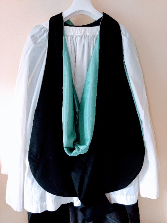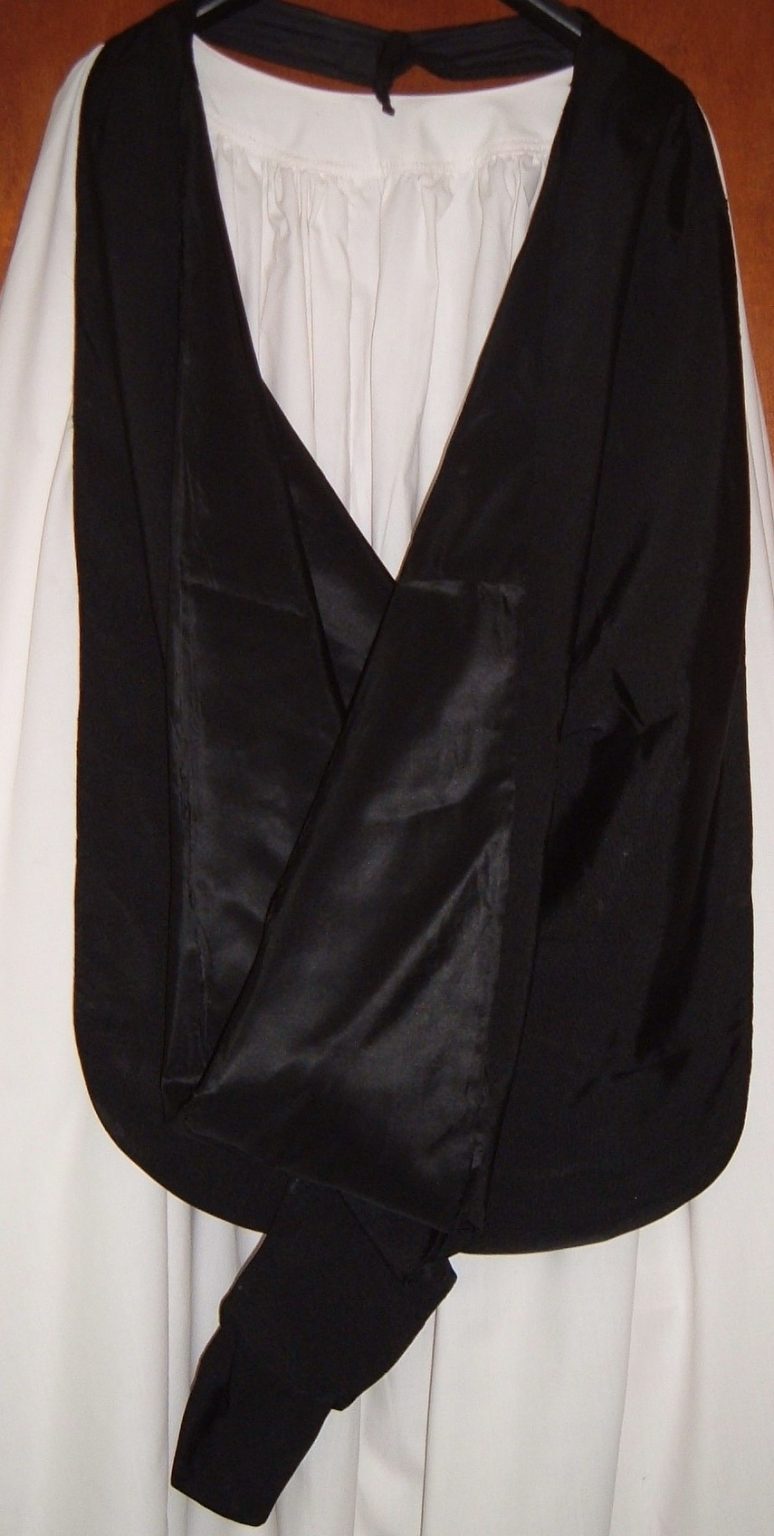 St Aidan’s was founded in 1846, and at some point adopted a hood of black, lined and bound with silver-grey, and as was usual with theological college hoods at that date could be made in either full [f1] or simple [s1] shape. In 1882 the lining was reduced to a 2” border in keeping with the decree of Convocation. By this time, the full shape had become the specified one. This particular hood is also lined with black stuff, though other examples are not: this was never set down, and the same variety occurs with other college hoods.