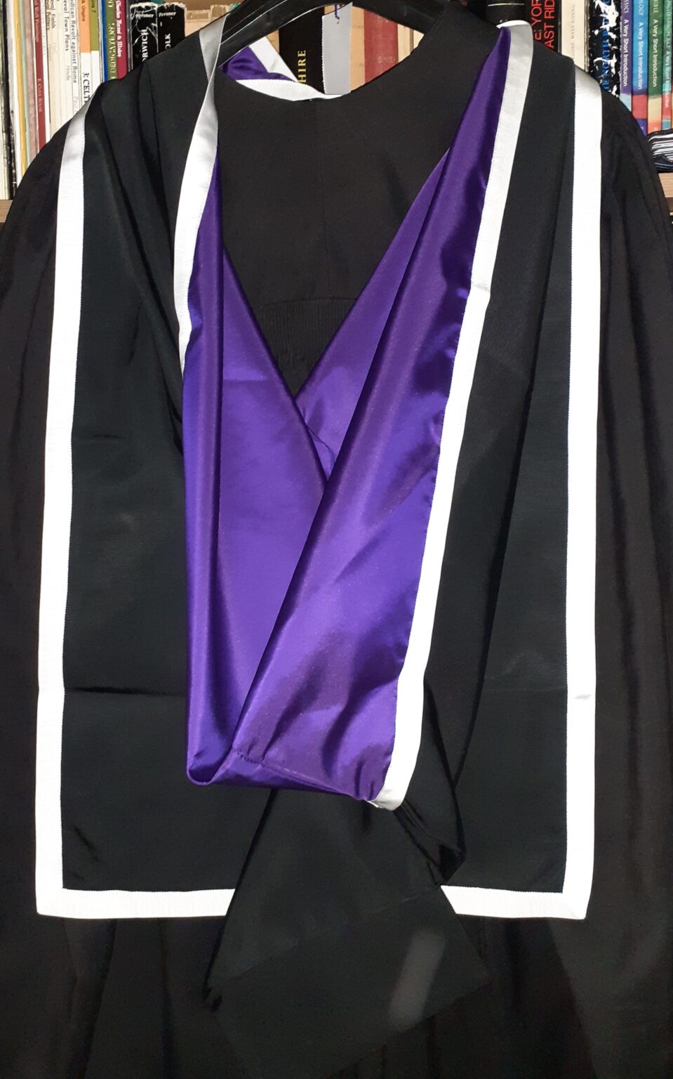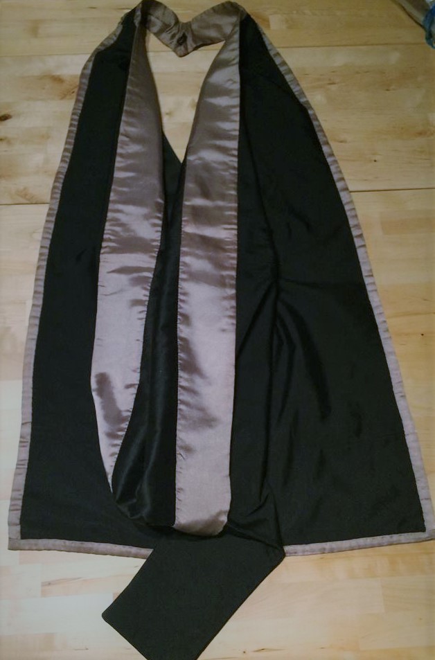 Other than the MA, masters’ degrees were a late addition to Aberdeen. The MA wears a black hood lined white, and bachelors, black hoods lined with the faculty colour. It was decided to mark the postgraduate masters by giving them white hoods lined with faculty colour. The MBA is lined with lilac.