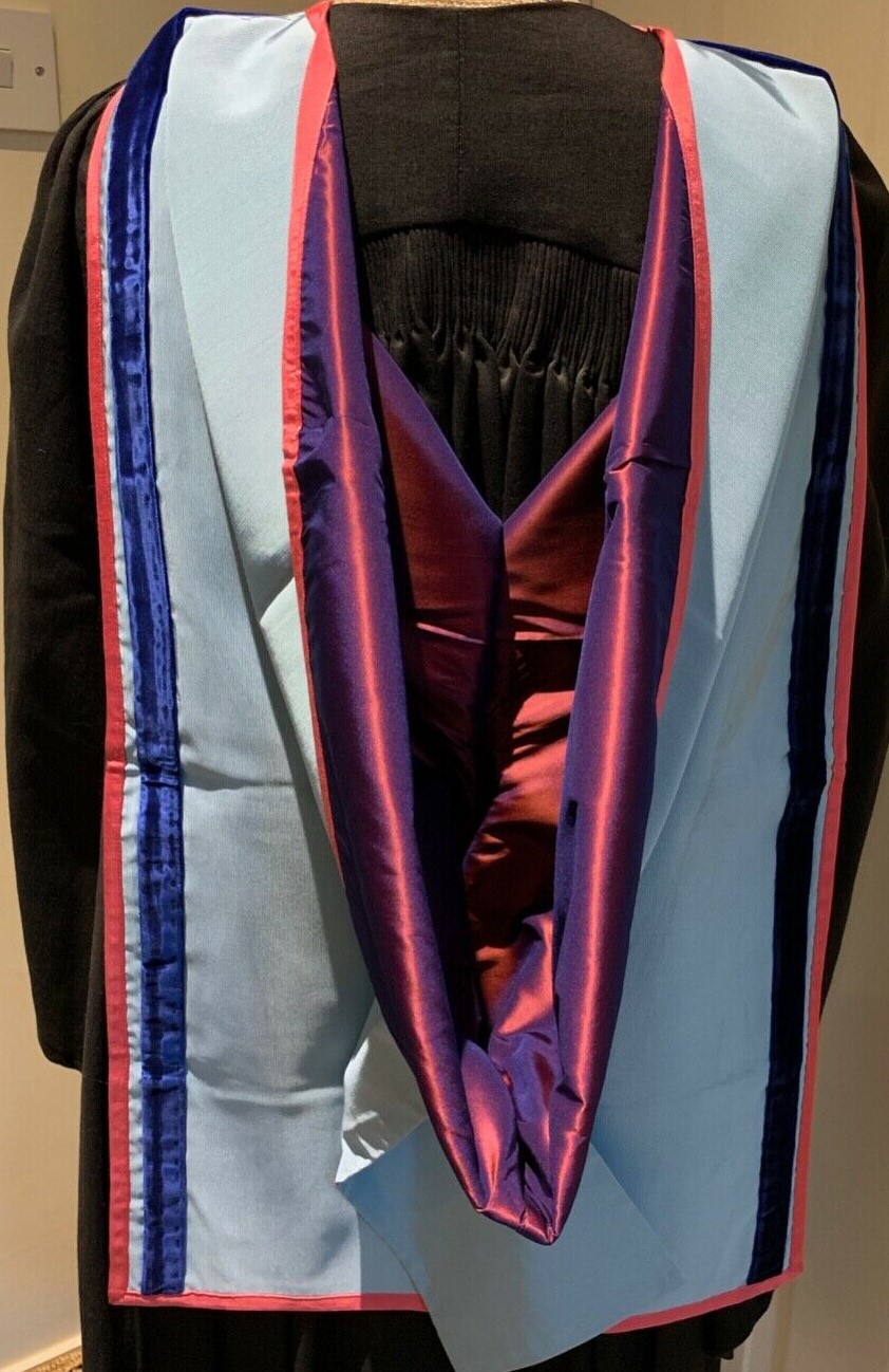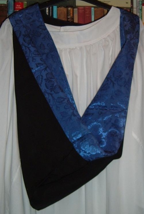 All Surrey hoods are all lined with blue damask, the first university to do this, though of course Doctors of Music had been using cream or white damask robes and hoods for many years. The bachelors’ hoods are of a special simple shape, shared by Aston, which has no liripipe [s10]. Originally, there were just two bachelors’ degrees, BSc and BMus. The BSc had the black and blue hood, and the BMus was differentiated by adding a border of white damask. When other degrees were added (BA, BEd, LL.B, etc), they were given coloured borders also, though of plain taffeta, leaving the BSc with the basic hood. This carries right through the masters’ and doctors’ hoods.