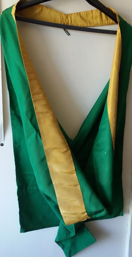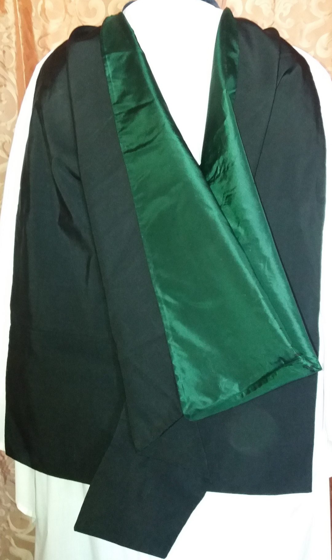 The hood of this college is noted as being fully lined with silk of thistle green. In 1882, the Church of England’s Convocation laid down that theological college hoods were to be black stuff, with a border of up to two inches of coloured silk, but as the Scottish Episcopal Church did not come under its remit, it retains its full lining – and the shell is of black silk, also. ‘Thistle green’ refers to the green used by the Order of the Thistle for its insignia.
